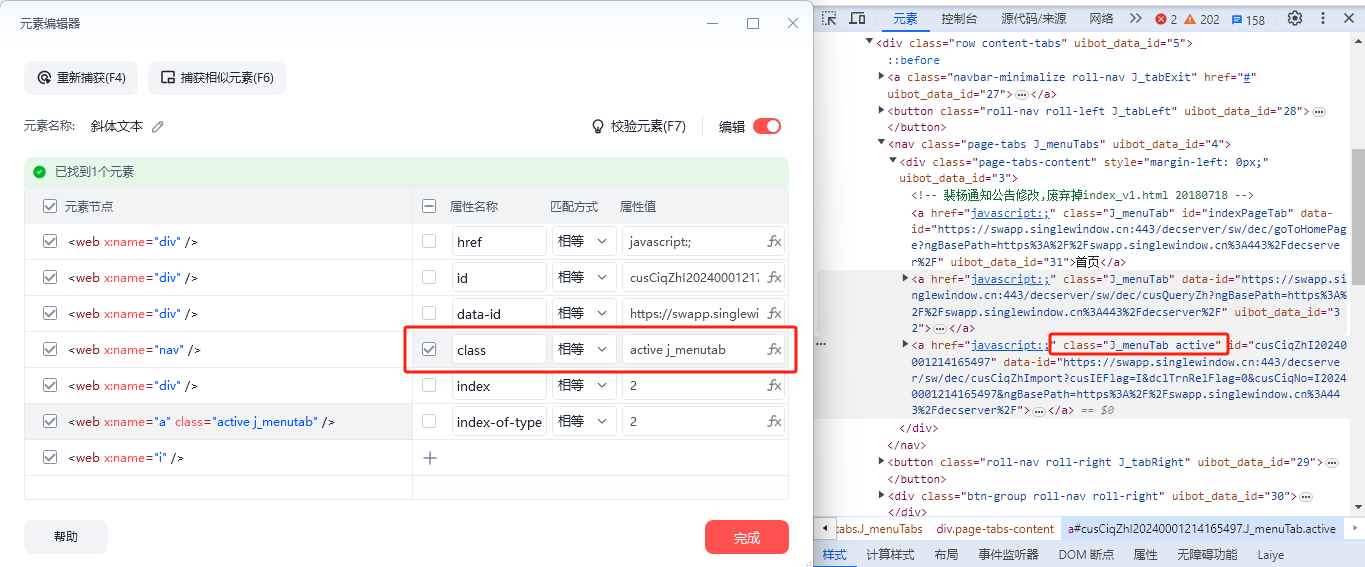我在一次使用元素编辑器时,突然发现如图所示,我选择了一个按钮,通过其上级元素的class来定位,也就是上一级元素是一个标签,当这个标签被选中时,class就会变成"active"状态,但是这个“active”并不是一直在原本的“J_menuTab”的后面,二是一开始在前面,如左边的元素编辑器中所示,并且左边的一列元素节点中的其他节点元素的属性全部都没有启用。但是此时元素编辑器中的class属性与网页中元素的class属性明显是对不上的,为什么还是能够校验到一个唯一的元素呢?