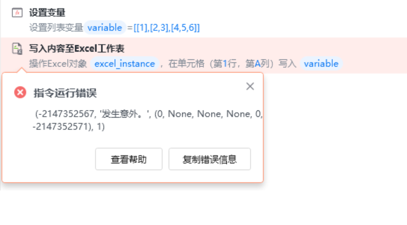 将二维列表(如:指令“批量数据抓取”得到的数据)写入 Excel 时报错 (-2147352567, '发生意外。', (0, None, None, None, 0, -2147352571), 1)