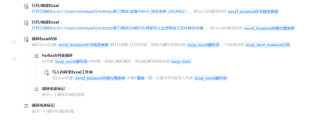 想请教一下这个流程有什么逻辑上的问题吗?为什么每次填到Excel中只有一行内容