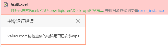 以管理员身份运行影刀时,【启动Excel】指令会抛出异常,如下图: