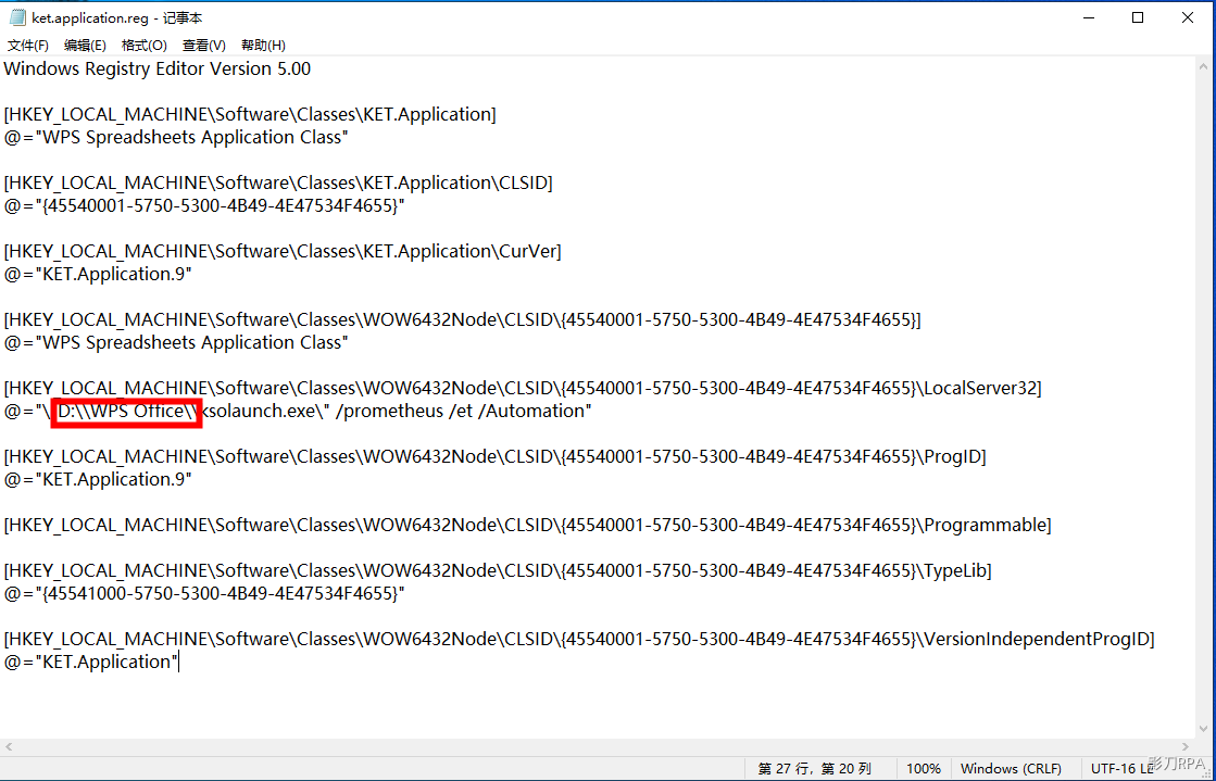 原因是WPS在安装时,只会将相关的注册表信息写入到HKEY_CURRENT_USER下。而以管理员身份运行影刀时,影刀会到HKEY_LOCAL_MACHINE里面去查找相关的COM组件注册表信息。
