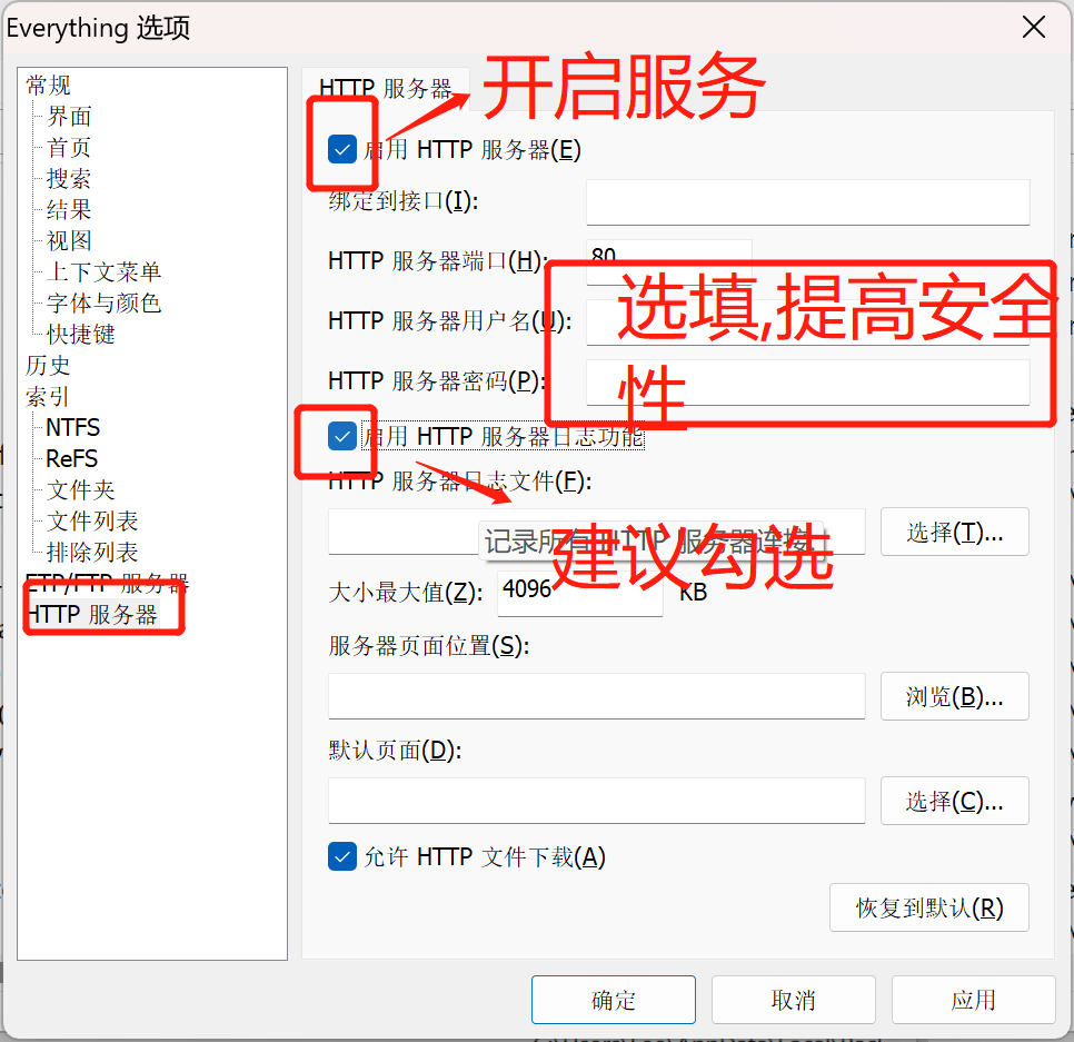 2. 勾选'启用HTTP服务器',根据实际需要设置访问的账号密码(留空也是可以的),即可快速开启everything的http服务。