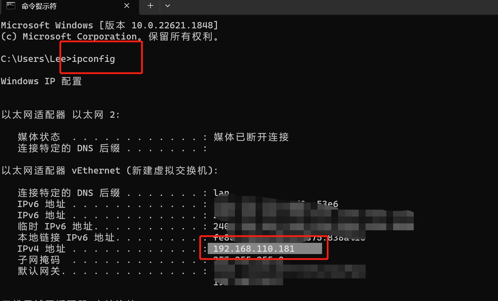3. 开启http服务后,本机地址访问的方法,可以直接访问 http://127.0.0.1/ ,如果端口号80,则不用加端口号,如果端口号设置为80以外的数字,则访问 http://127.0.0.1:端口号 即可. 如果是局域网内的电脑要访问,则先查询本机的电脑IP地址,可以在电脑的cmd输入 ipconfig,确认一下IP,并直接在浏览器输入对应的ip地址+端口号即可,如: 192.168.110.181:端口号