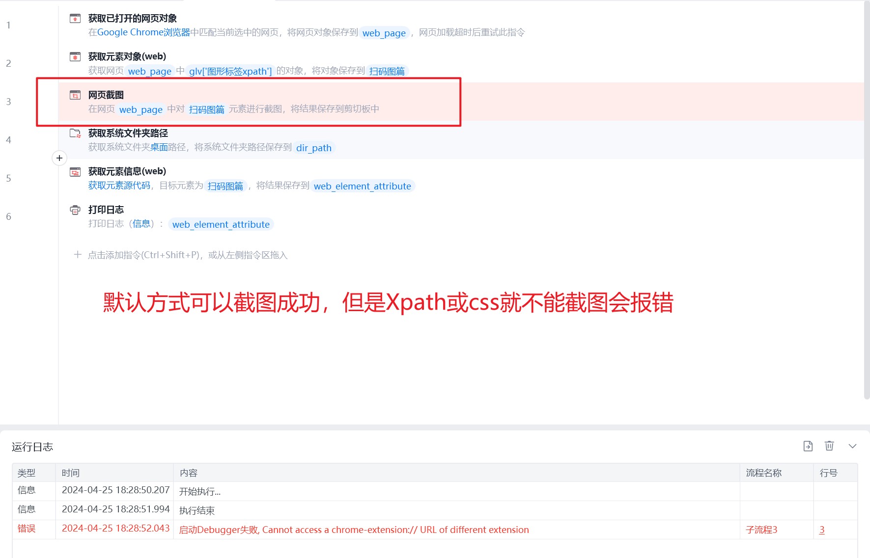 网页截图无法适用于xpath和css定位的元素,只能适用于默认??