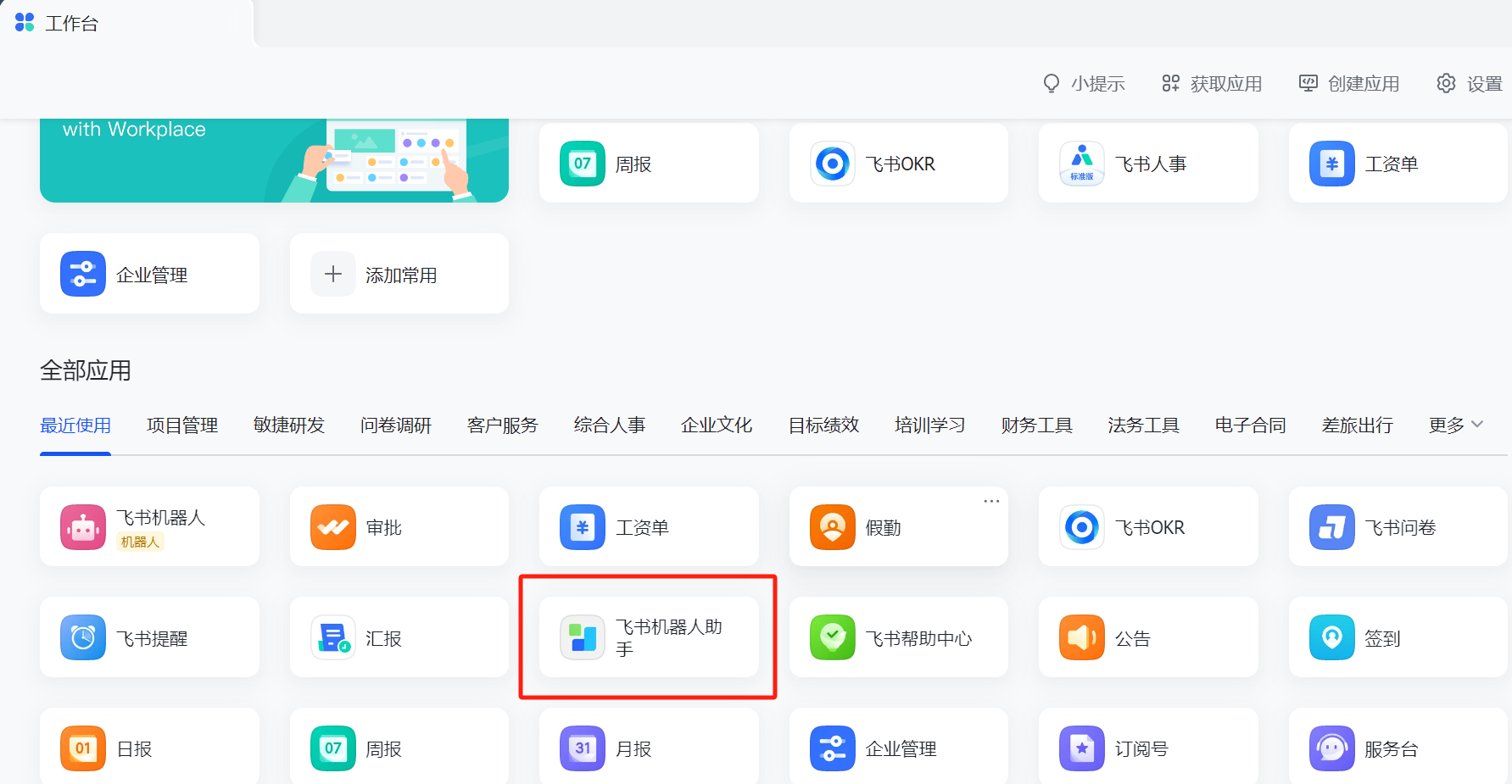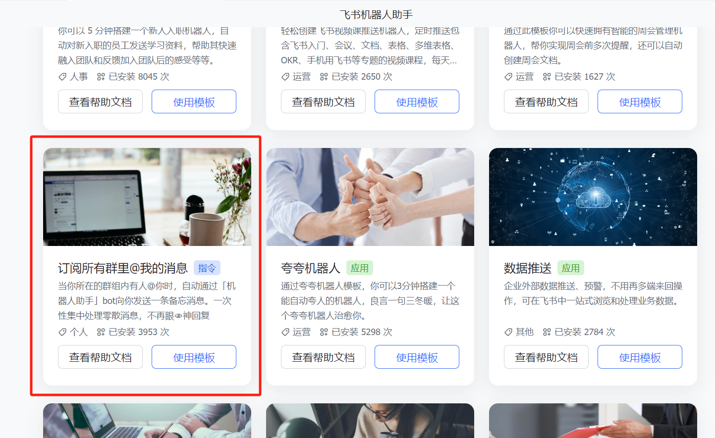 进入飞书工作台——>打开飞书机器人助手——>使用订阅所有群里@我的消息
