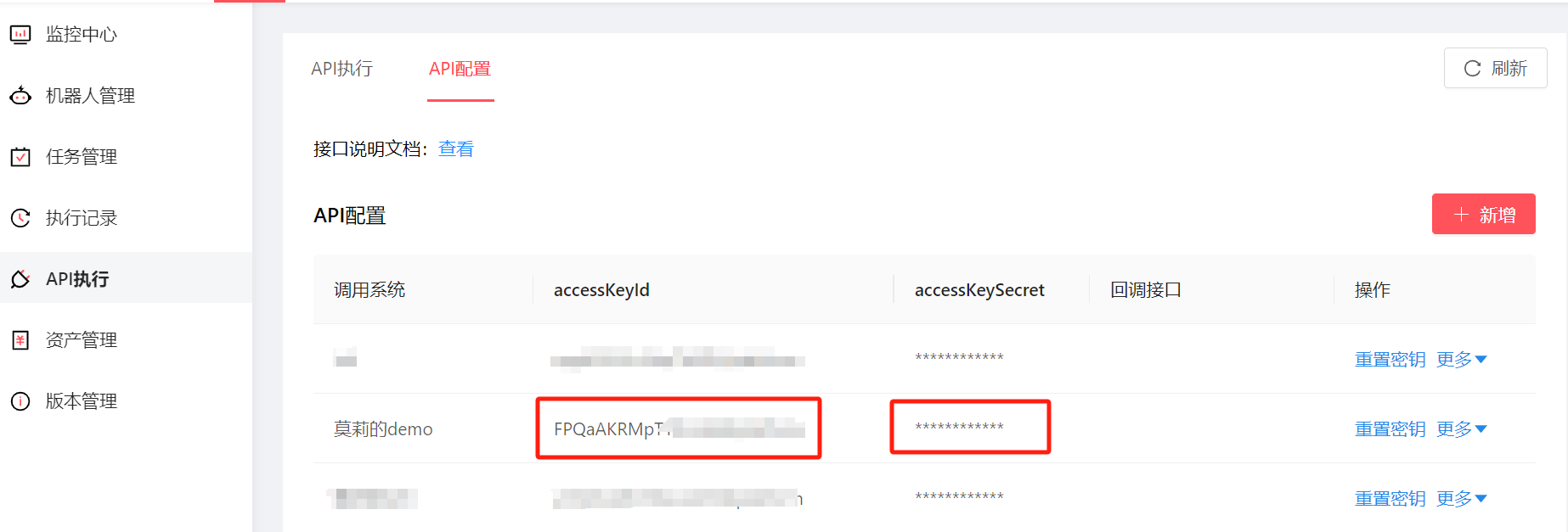 打开影刀控制台——>进入调度中心——>进入API执行(API配置)页面——>新增调用系统——>生成accessKeyId和accessKeySecret