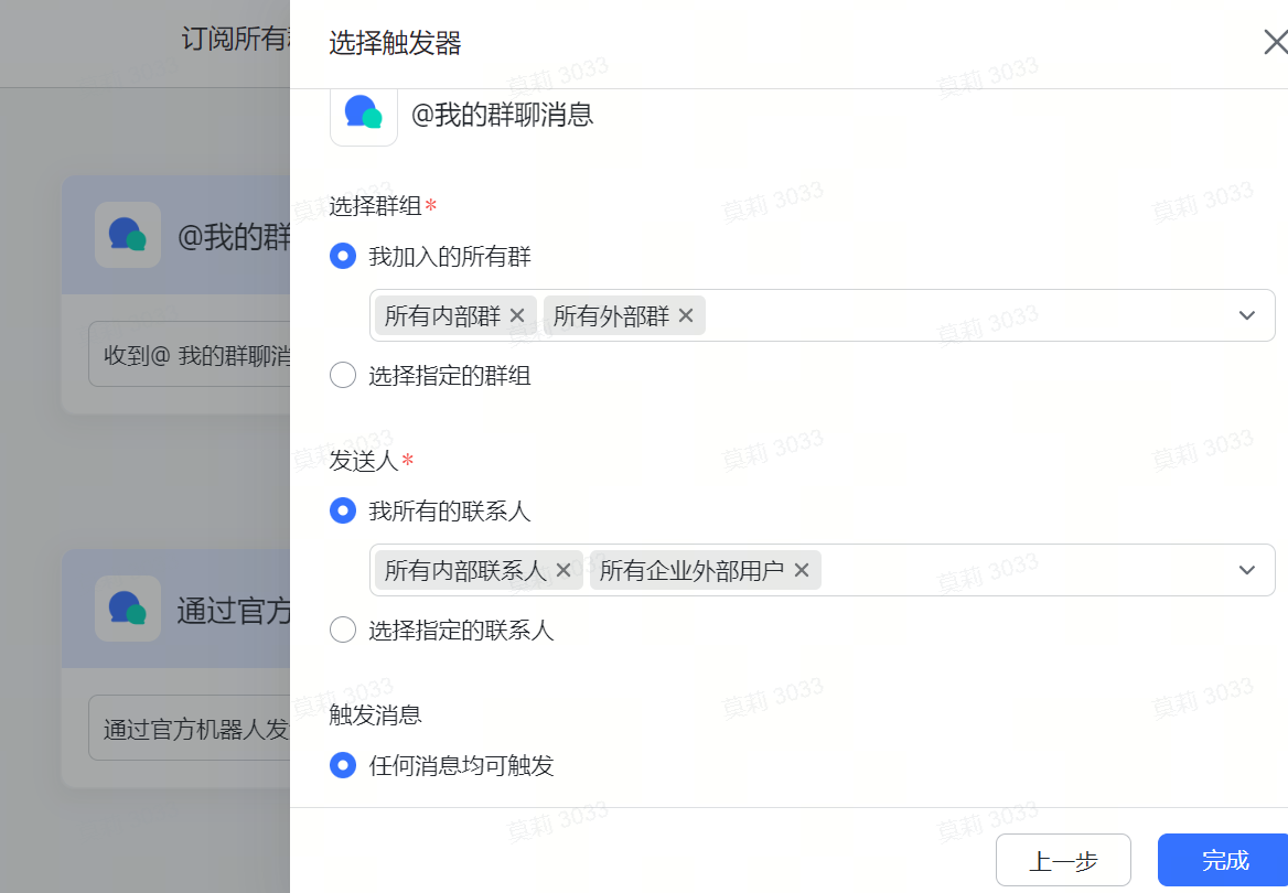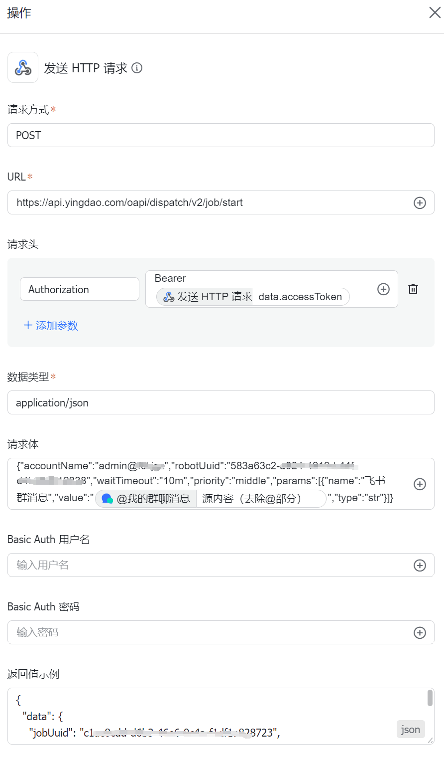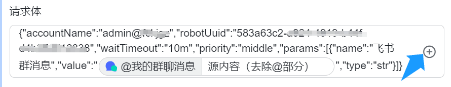 示例:{"accountName":"****","robotUuid":"*****","waitTimeout":"10m","priority":"middle","params":[{"name":"飞书群消息","value":" @我的群聊消息源内容(去除@部分) ","type":"str"}]}