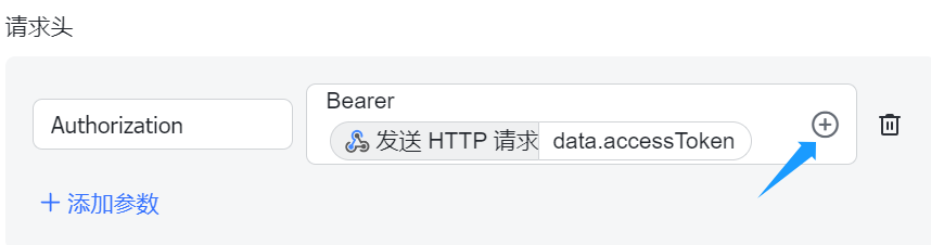 输入Bearer,空格,点击“+”,选择data.accessToken,将上一个HTTP请求返回的accessToken传进来