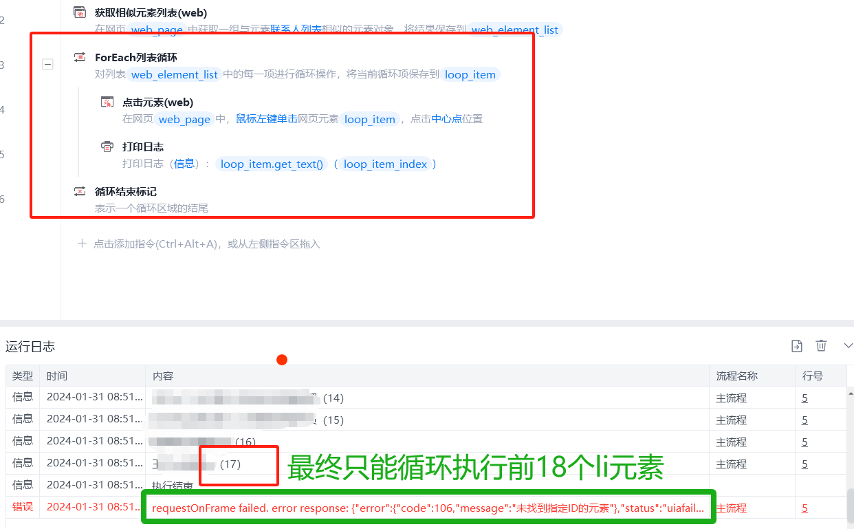 场景如下:需要在BOSS直聘网页版 https://www.zhipin.com/web/geek/chat 对联系人列表进行循环点击、提取网页信息,通过影刀指令可获取li元素40个,但进行列表循环时只能循环18个li元素,第19个开始提示“未找到指定ID的元素”,报错信息如下: