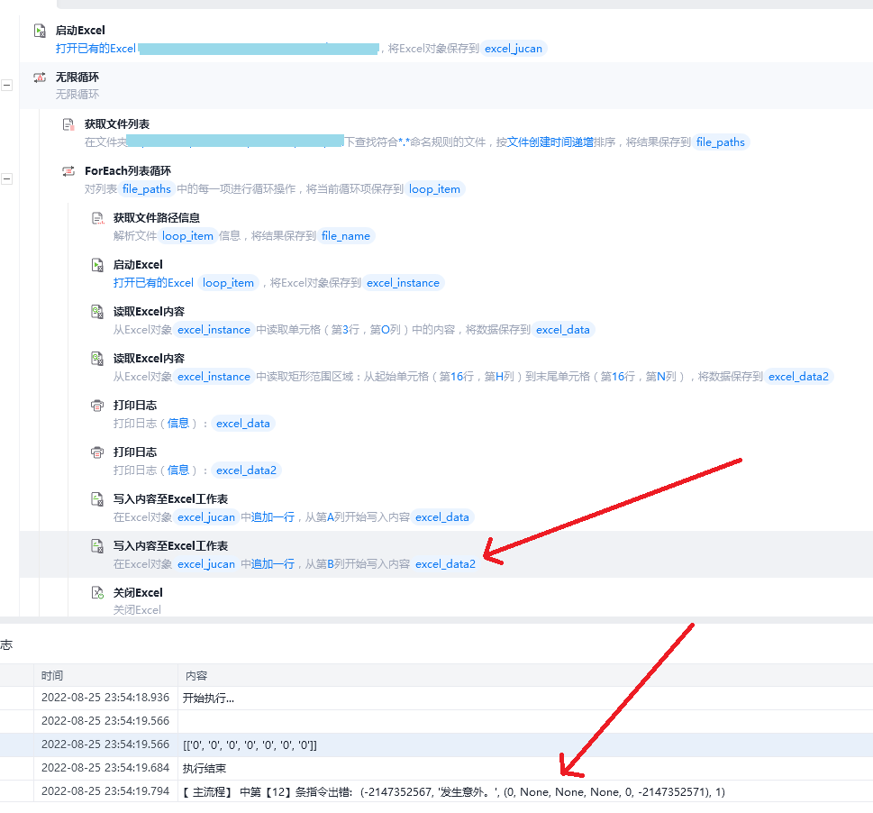 如图,我要从一个文件夹中循环读取每个表格的两个固定位置数据,写入到一个汇总表中,执行到第二个写入时就出错了