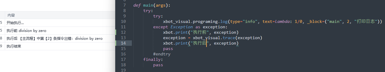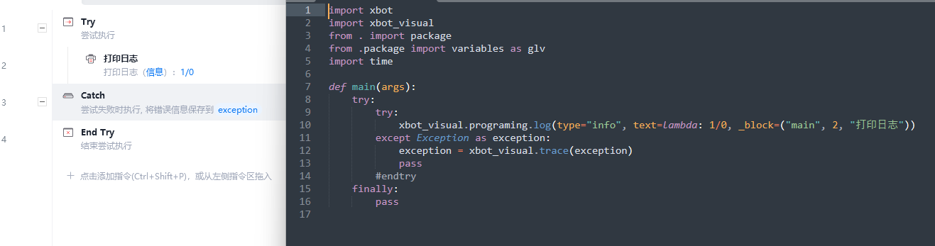 1.当使用try...catch时,源码中会多出一行代码:exception = xbot_visual.trace(exception)