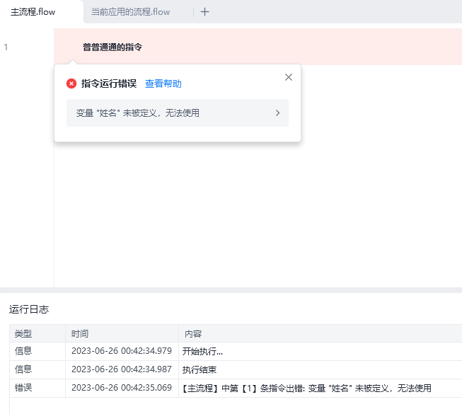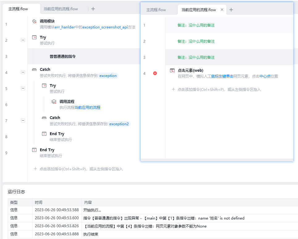 2.在【普普通通的指令】中写一个异常代码,在【当前应用流程】写一个异常代码。运行后如下图日志所示,可以清楚的知道指令中的报错位置和当前流程中的报错位置