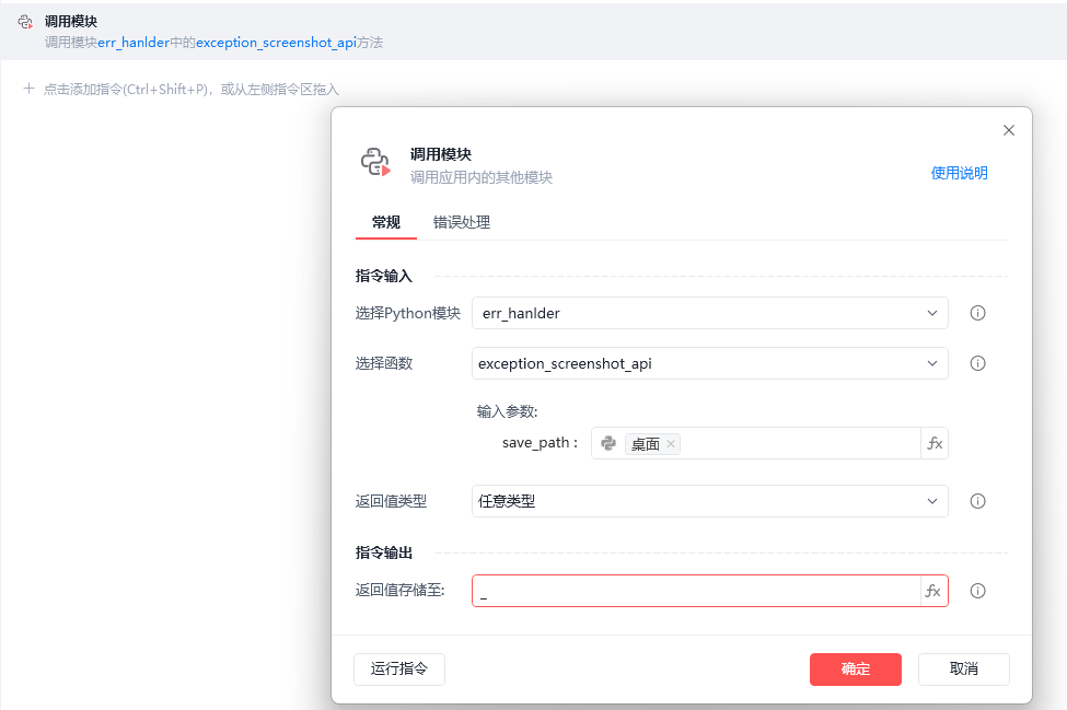 3.在主流程第一行使用指令【调用模块】,传入图片保存文件夹。如下: