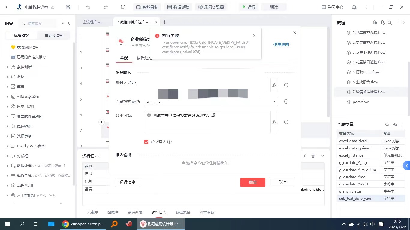 企业微信推送消息提示:流程执行失败: <urlopen error [SSL: CERTIFICATE_VERIFY_FAILED] certificate verify failed: unable to get local issuer certificate (_ssl.c:1076)>