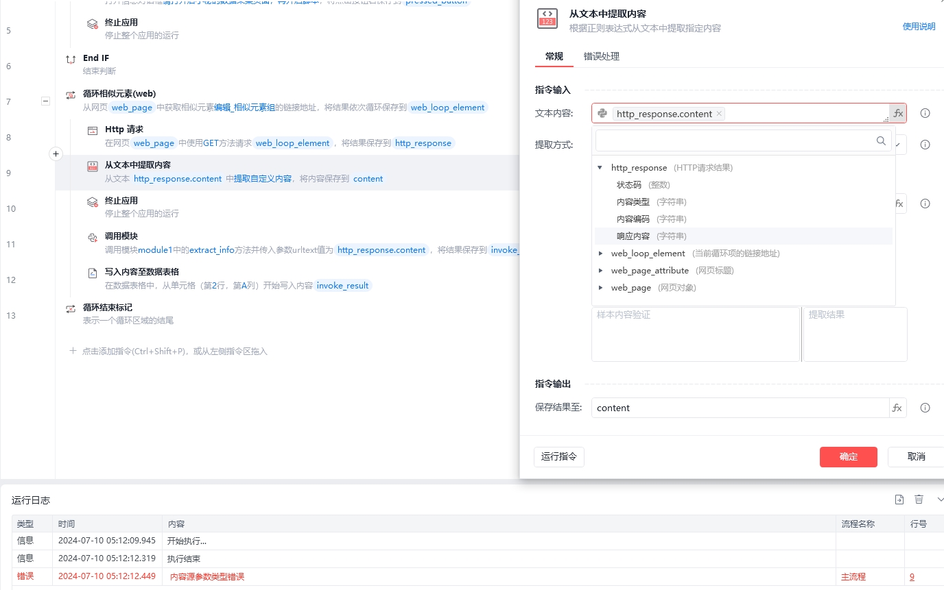 但对文本提取内容时,提示内容源参数错误。