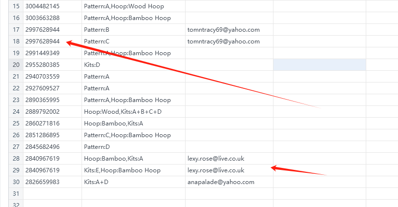 最终想要呈现的形式如下,有可能一个订单号 对应2个及以上的子订单(就相当于一个人买了2件不同商品以上)--就是email要对应