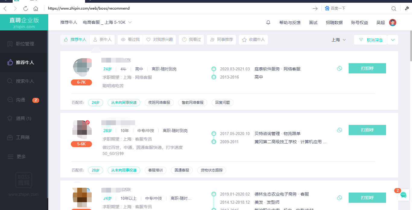 比如在BOSS直聘上,批量点击“打招呼”按钮,同时使用鼠标滚轮下滑,保证不重复