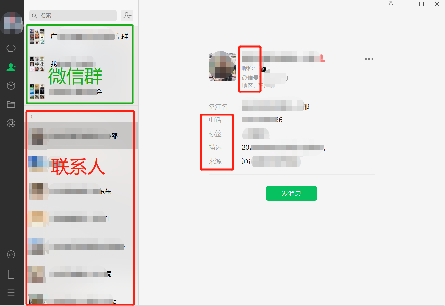 如图所示,我联系人有小几千人,微信群百来个,我想将联系人通过获取相似元素的方式进行循环点击,获取昵称、微信号、地区、备注、电话、标签、描述、来源等信息,然后导出到excel,但是我获取相似元素时它会把微信群一起获取进去,这样就没办法实现我的需求,所以想请教各位大神能否指教一下如何只获取到所有联系人的相似元素组。感谢感谢!