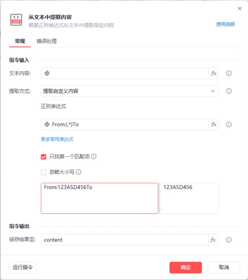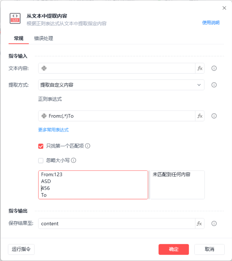 在影刀中使用模式就是(?模式修饰符),其中全局匹配跟忽略大小写指令中已经自带