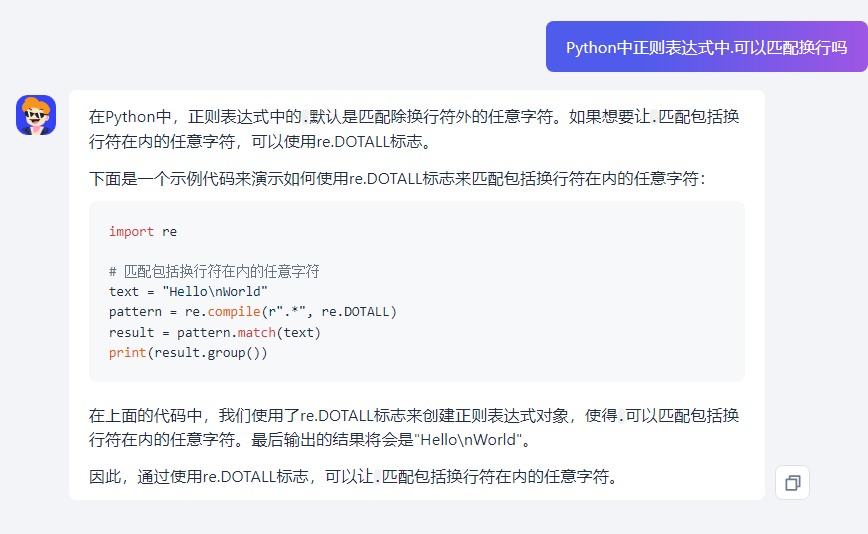 原来正则表达式中的.默认是匹配除换行符外的任意字符,要想.匹配换行,需要开启模式修饰符re.DOTALL