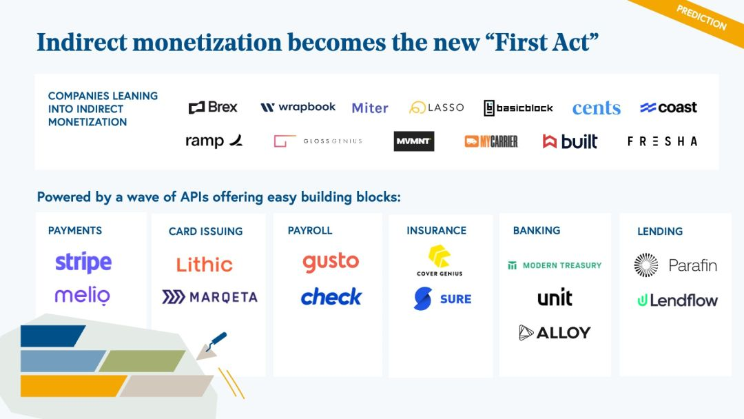 由于 API 的激增,比以往任何时候都更容易构建通过一系列辅助服务间接获利的产品。公司甚至跳入完全免费的软件作为潜在客户生成策略,以获取更有利可图的间接货币化。