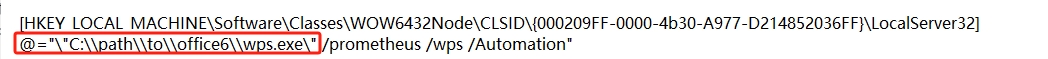 @="\"C:\\path\\to\\office6\\wps.exe\" /prometheus /wps /Automation"