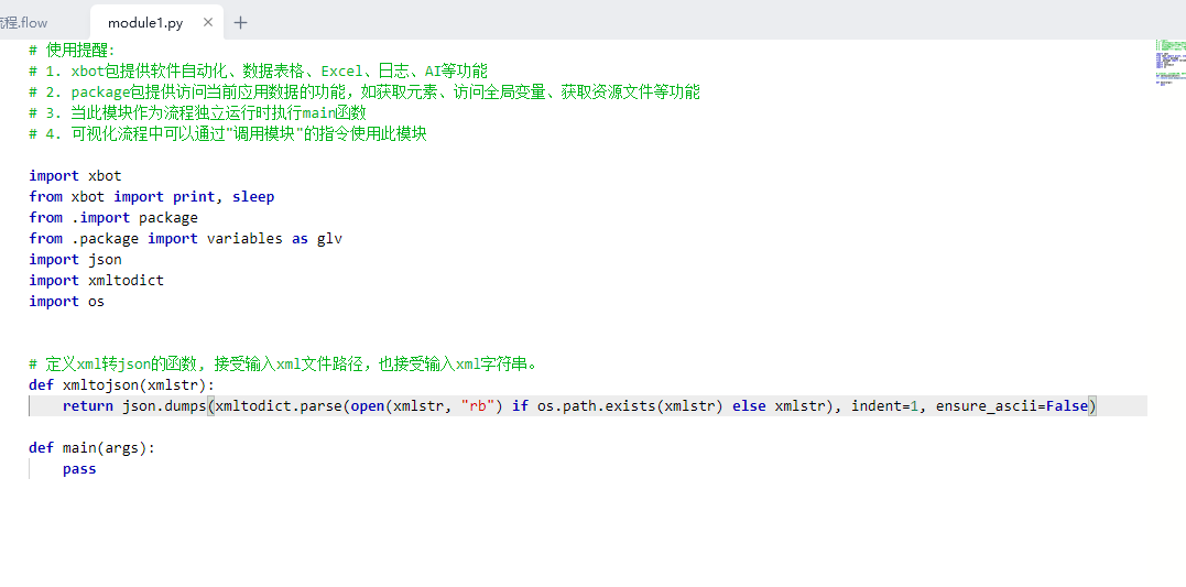 import json import xmltodict import os # 定义xml转json的函数, 接受输入xml文件路径,也接受输入xml字符串。 def xmltojson(xmlstr): return json.dumps(xmltodict.parse(open(xmlstr, "rb") if os.path.exists(xmlstr) else xmlstr), indent=1, ensure_ascii=False)