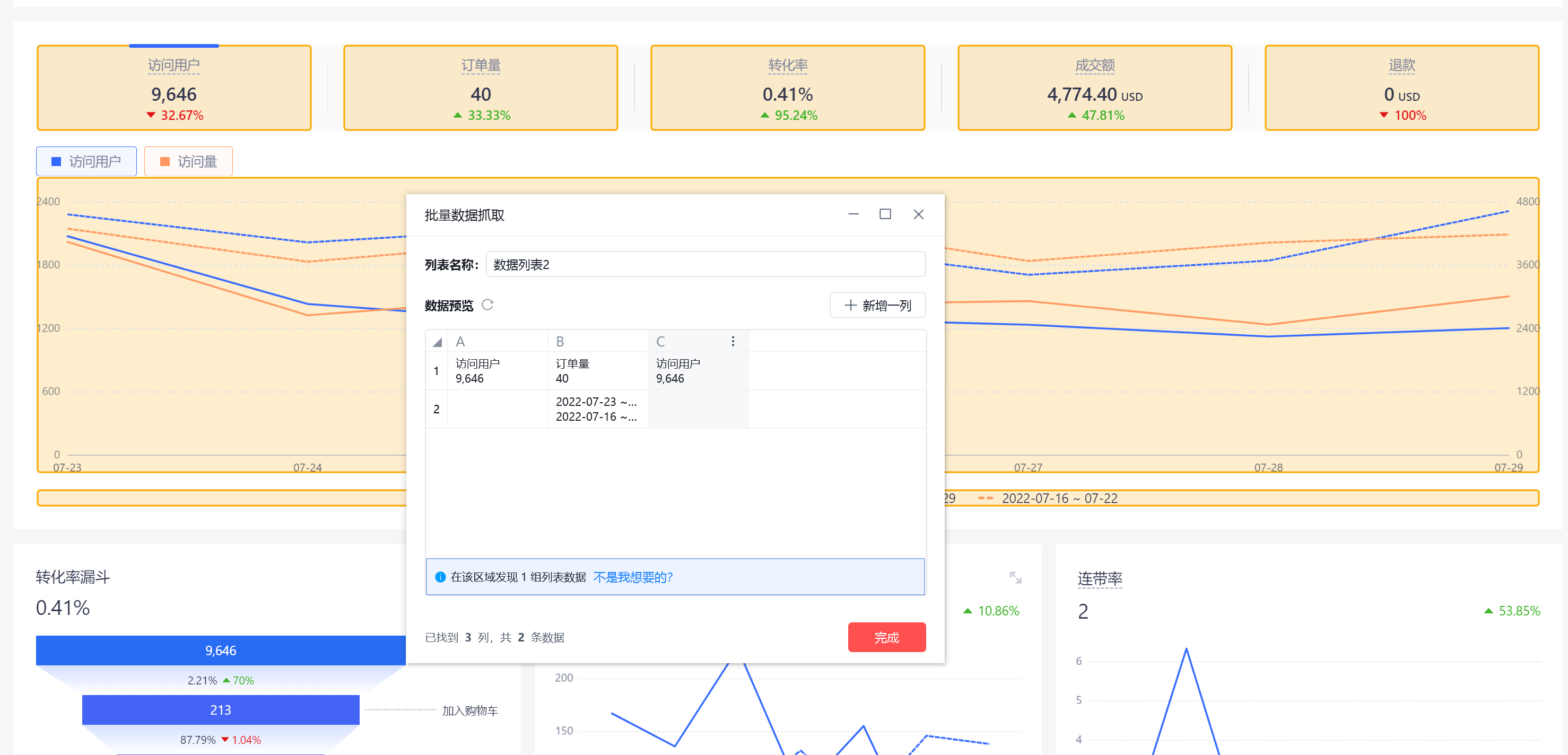 2.单个数据抓取后,抓取的数据都是重复的。如图:我想抓取转化率,但是抓到的是访问用户