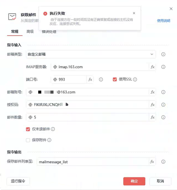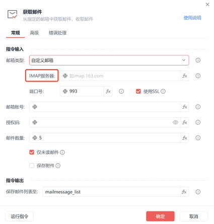 目前影刀官方指令自定义邮箱只支持 imap 协议读取邮件,所以该功能需要自己编写python代码