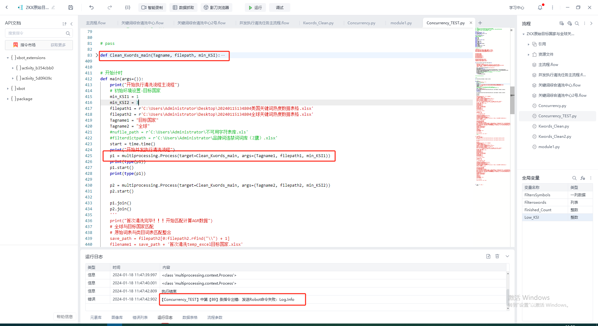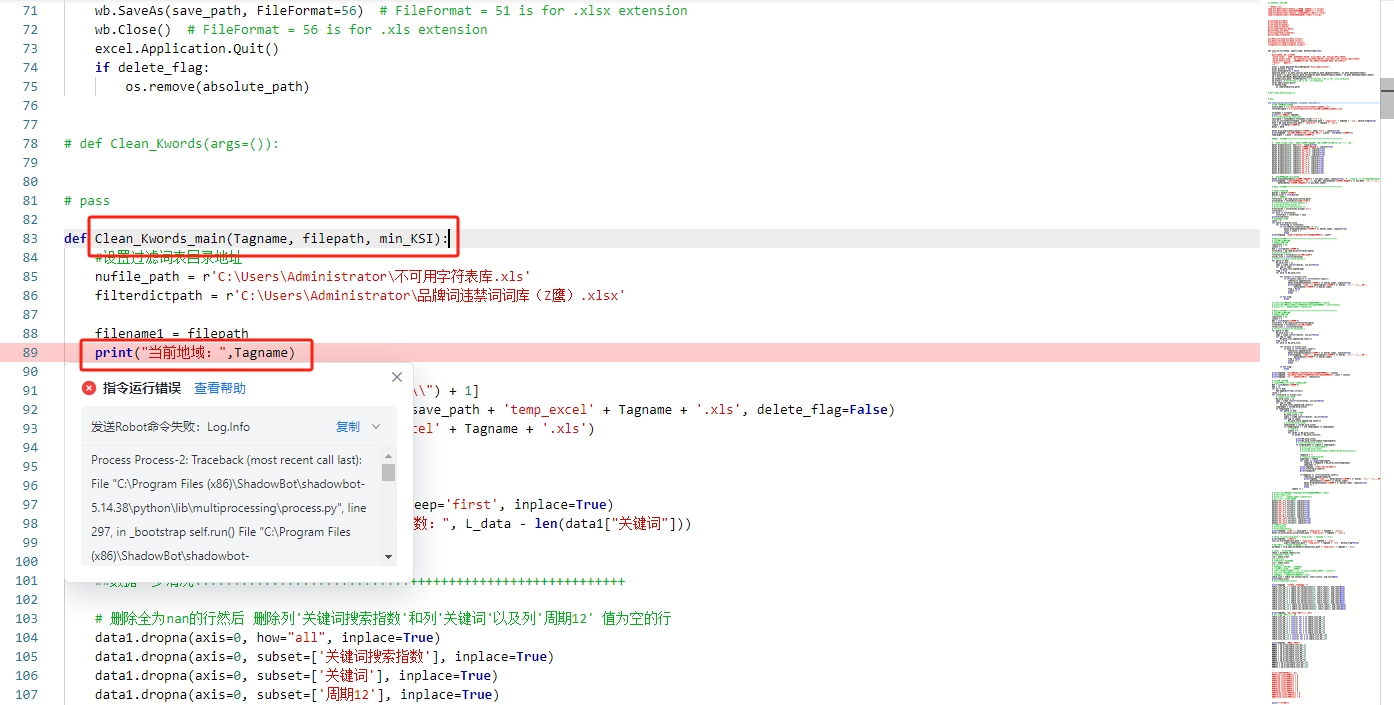 File "C:\Users\Administrator\AppData\Local\ShadowBot\users\42756661844389889\apps\b3b6fa59-6c5d-4355-a828-8dbb23ca5771\xbot_robot\Concurrency_TEST.py", line 89, in Clean_Kwords_main