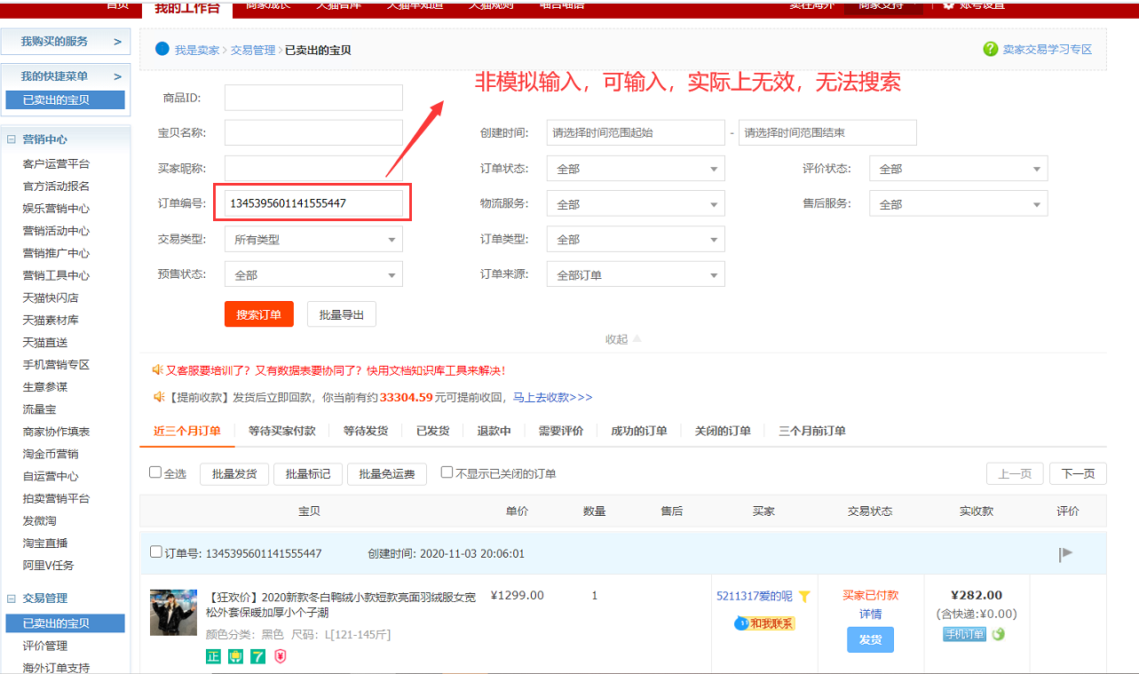 在一些网页,如天猫【已卖出的宝贝】界面,【填写输入框(web)】指令选择自动化接口输入,可以输入数据,如图所示