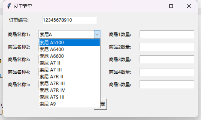 tkinter 创建一个图形化界面,其中包含订单编号输入框,以及商品名称和商品数量的输入对。AutocompleteCombobox 类提供商品名称的自动补全功能,通过模糊匹配实现用户输入的智能建议。json.dumps() 方法将该字典转换为 JSON 格式字符串,并存储在全局变量 loop_json 中。loop_json 变量中,便于后续的使用或保存到文件、发送到服务器等操作。2.2 输入项修改方式