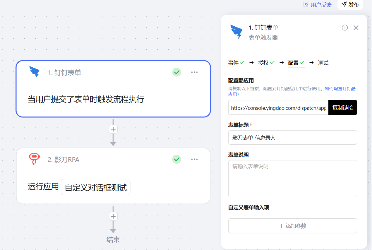 针对问题1,可以在维持原本“表单触发方式”的情况下,在下方增加一步“运行RPA应用”,用RPA的“自定义对话框”来代替钉钉表单的输入项
