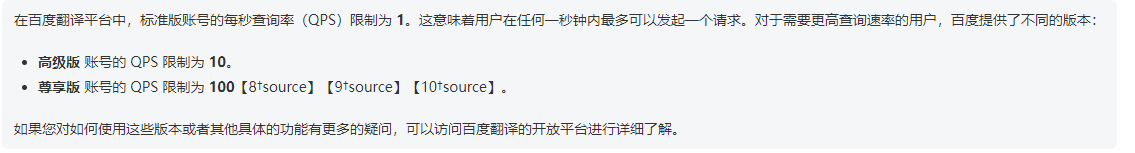 如果待翻译的内容较多,而且较追求翻译准确度时,需要适当控制使用中英文翻译指令的频率,即控制调用接口的频率,以下是有道API文档给出的请求频率以及查询字符数要求,虽然请求频率和单次查询最大字符数都挺多的,但这是付费模式下的,对于免费的自然语言翻译服务,各接口只给一定量的免费查询字符数。所以有时候报错了,不一定是请求频率的问题,也可能是免费查询字符数用完了。。。。。。
