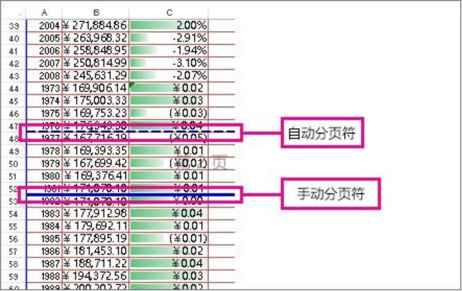 这里我们就需要了解一下了,在Excel的“分页预览”页面中,虚线是 Excel 自动添加的分页符, 实线是手动添加的分页符,所以其实我们代码运行完添加手动分页符时,保留了原来的自动分页符