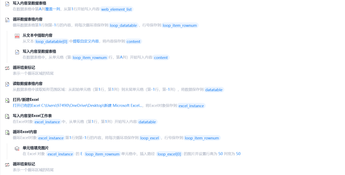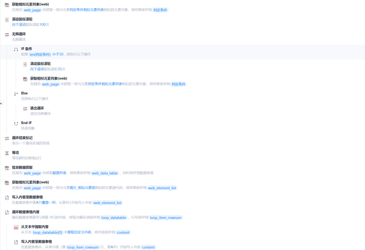 由于插件所展示的图片界面为动态加载,所以需要在爬取数据时进行下滑加载的操作,但是由于该插件的相似图片判断方法较为宽泛,导致只有前350左右(经过测试得知)的图片具有完全相似性,因此我们需要让rpa知道何时将流程终止,为了解决这个问题,在无限循环中使用了获取相似元素列表并进行列表长度的判断,当列表长度达到目标值时,退出无限循环并开始进行批量数据抓取(ps:经过测试发现图片的链接在利用批量数据抓取时,会出现个别链接错误导致图片无法下载,因此需要将图片下载链接单独抓取并写入数据表格。)