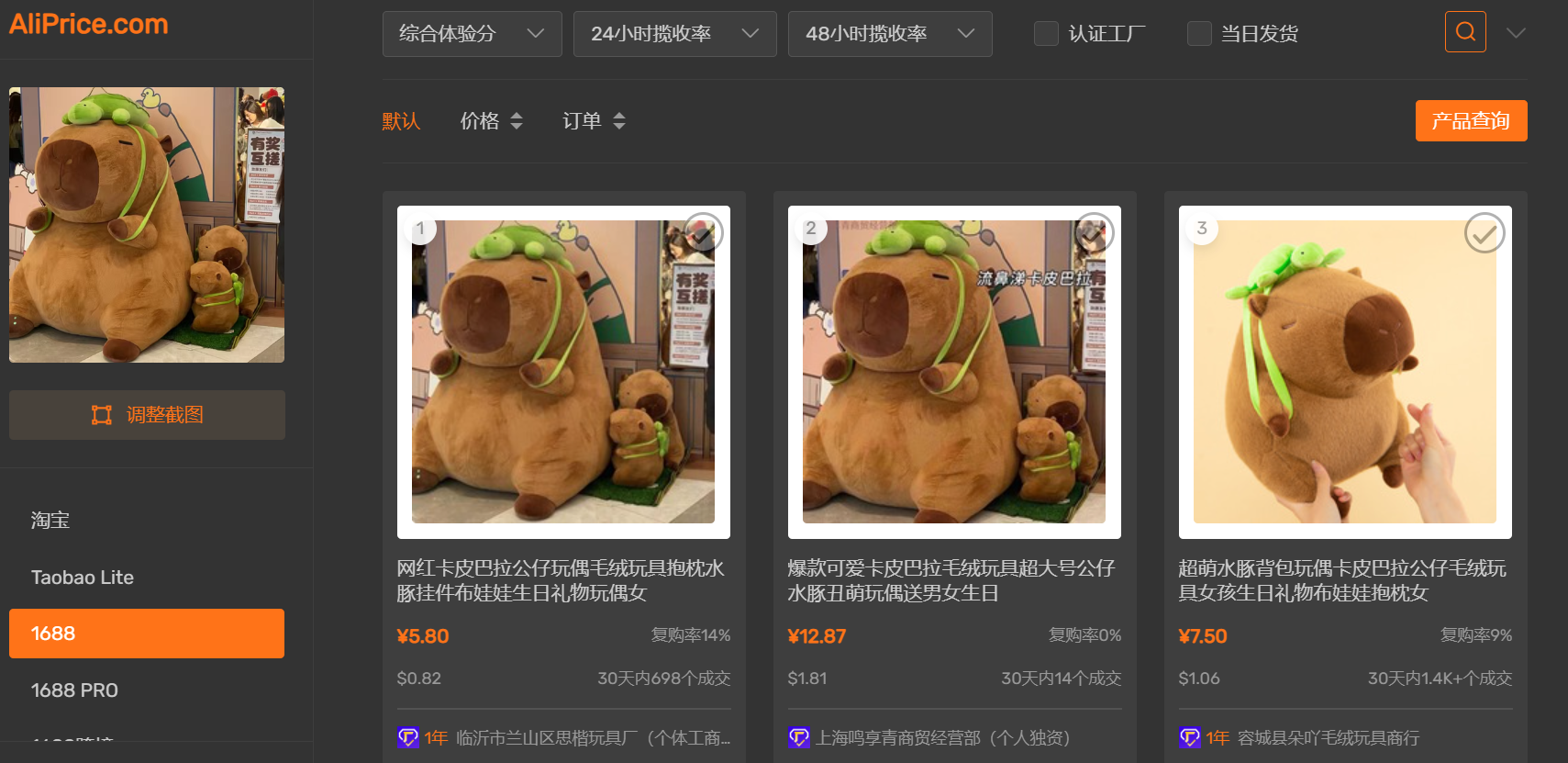 利用提前准备好的插件(https://www.aliprice.com/),将想要搜索的商品图片上传到插件中,并选择想要检索的平台,随后插件会帮助我们自动检索该平台的与图片类似的商品,并可进行商品的点击与信息查询的操作。