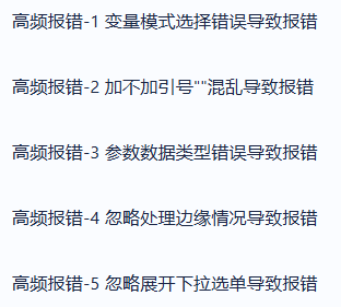 熟悉各种易错场景,知道高频错误通常在什么情况下会出现,你就可以在开发过程中,保持对细节的关注,提前根据你的数据情况做好预案,尽量在应用整体测试运行之前规避这些错误,提高应用开发效率!