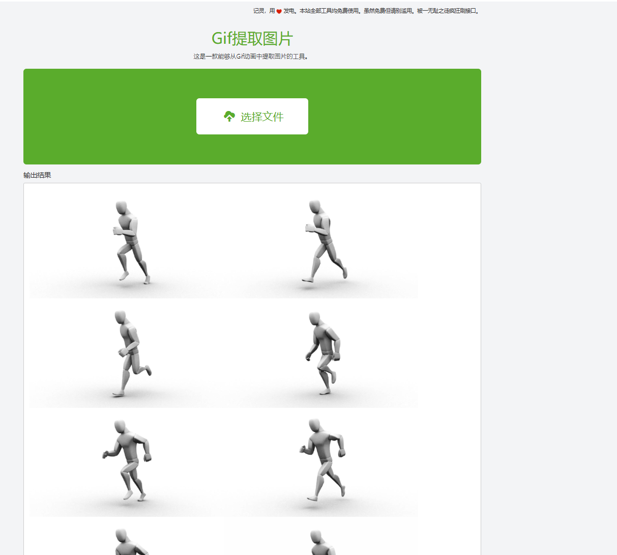 https://remeins.com/index/app/gif2jpg 这个用来把gif格式的常见动图,拆分成jpg格式;
