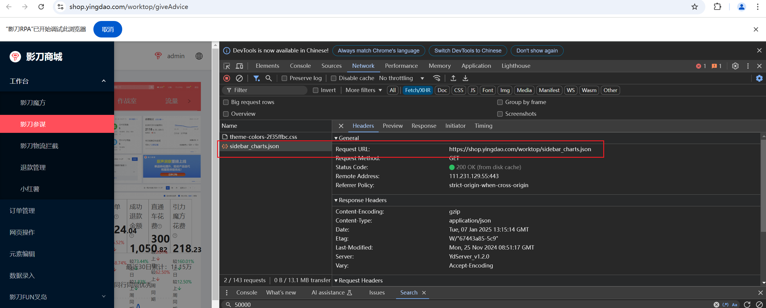 监听网页请求返回的数据为空获取的网页对象是https://shop.yingdao.com/worktop/giveAdvice监听的网址是https://shop.yingdao.com/worktop/sidebar_charts.json