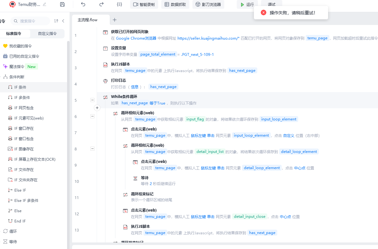 登录后无法拖动指令修改脚本,显示操作失败