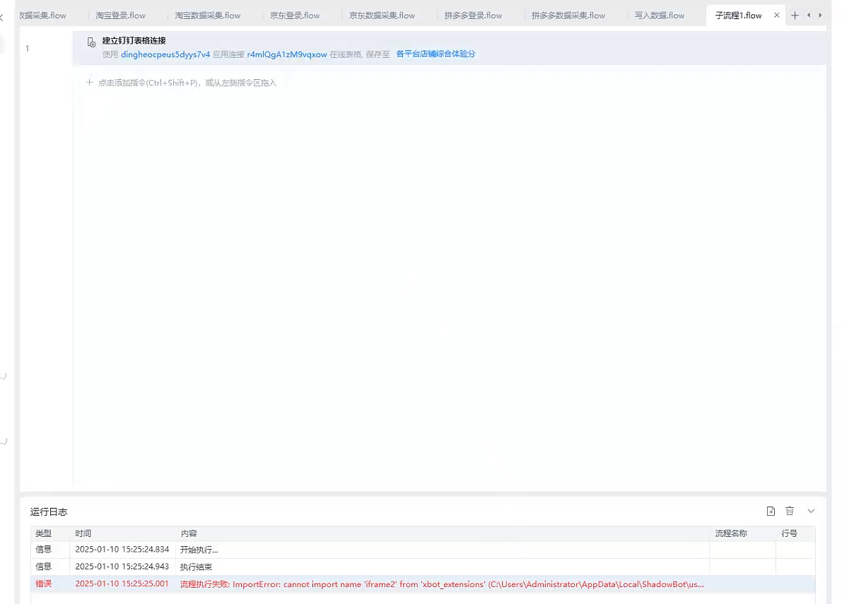 [错误] [2025-01-10 15:25:25.001] 流程执行失败: ImportError: cannot import name 'iframe2' from 'xbot_extensions' (C:\Users\Administrator\AppData\Local\ShadowBot\users\615390756219498498\apps\78885e3d-c11b-4eda-9a06-4c69a3e09caa\xbot_extensions\__init__.py)