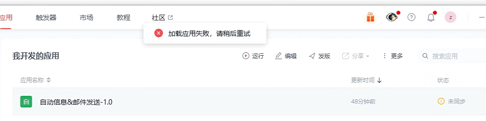 在编辑应用准备发版的时候,影刀突然重启更新了,然后刚刚还没发版的应用就再也打不开了,也无法发版,一直显示“加载应用失败,请稍后重试”