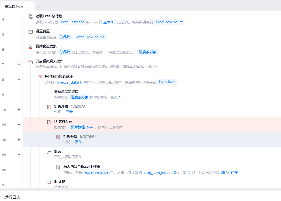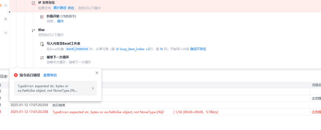 我要让影刀循环表格内容上传到网页,第一行我没填图片路径,所以报错了。