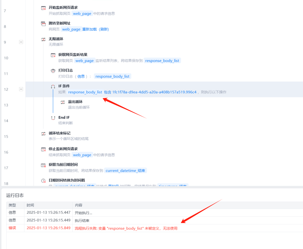 哈哈。打扰。循环监听网页请求结果,if条件包含响应值后退出循环。提示变量为定义,看看哪位老哥 给提醒一下,怎么处理