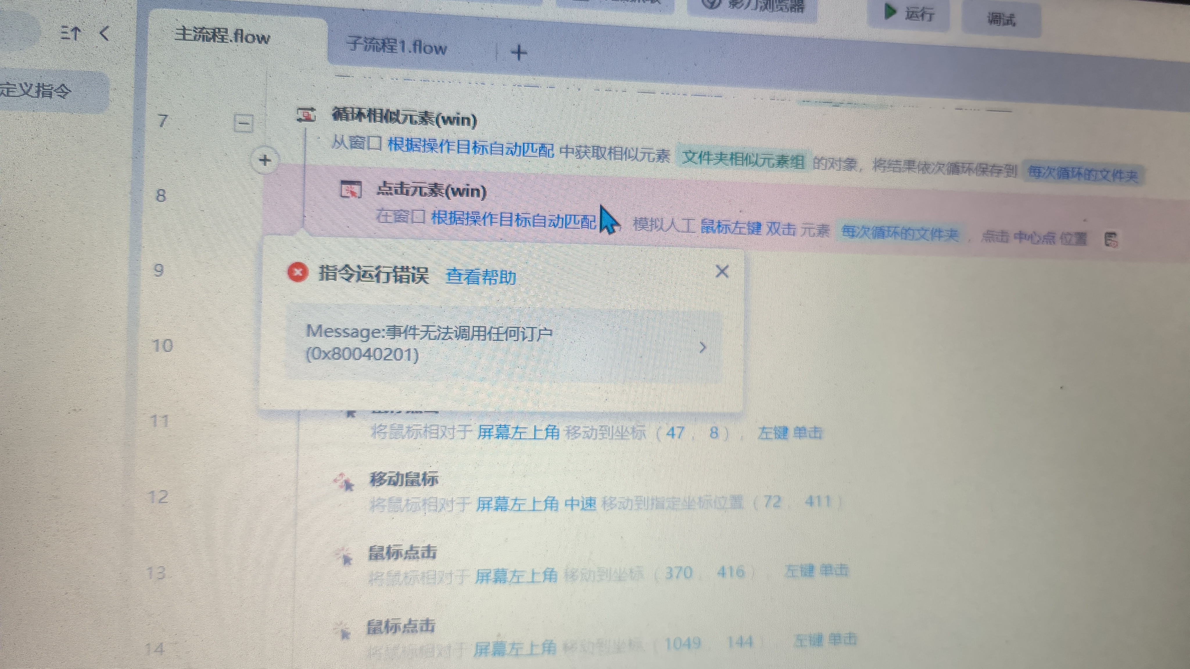 使用了循环相似元素模块搭建后 出现了这样的提示 ,我是在一个文件夹内有多个子文件夹,想要循环打开每个文件夹 ,第一遍运行可以打开文件夹内的第一个子文件夹,且后续自动操作都正常进行。在第二次开始循环时中断,并如此提示。