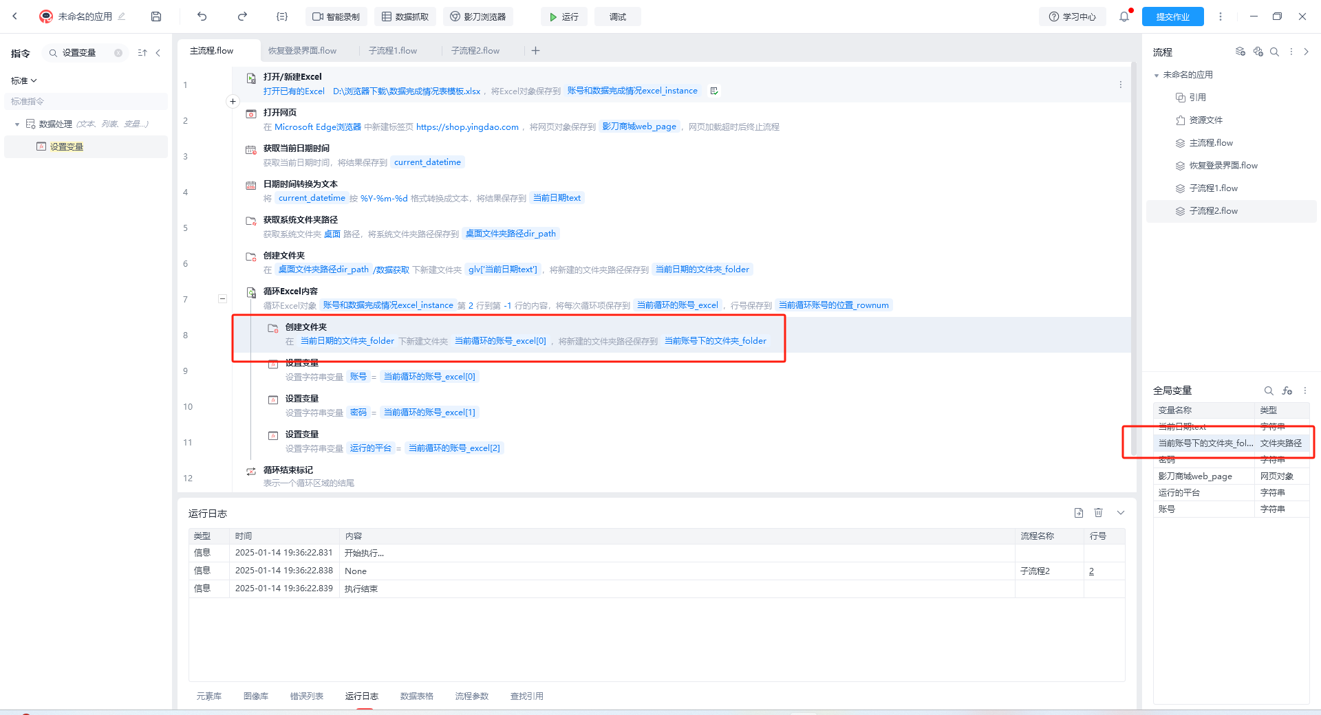 我想把这个文件夹路径设置为全局变量,但是我在子流程中调用的时候,是空值,请问是哪里出了问题呢