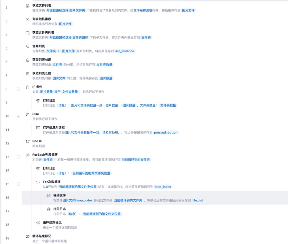 第三种是现在一个列表循环里面再套一个次数循环,有了列表循环的位置之后,在通过提取列表项获得另一个列表位置。但是发现要么是全部移动到了第一个文件夹中,要么就是移动一个后提示无法找到文件。就是只能识别到第一张图,再次循环还是第一张图,实际上第一张已经转移到文件夹中了。就会报错了。