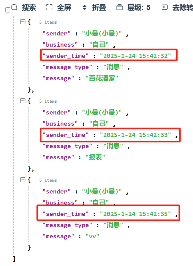 而使用《获取个人微信聊天内容》的时候,却缺少这样的时间标志,在需要进行聊天记录去重的时候是非常不方便的。因此我们要把他转换有带有时间标识的形式,跟企业微信一样,每一条都加上send_time。