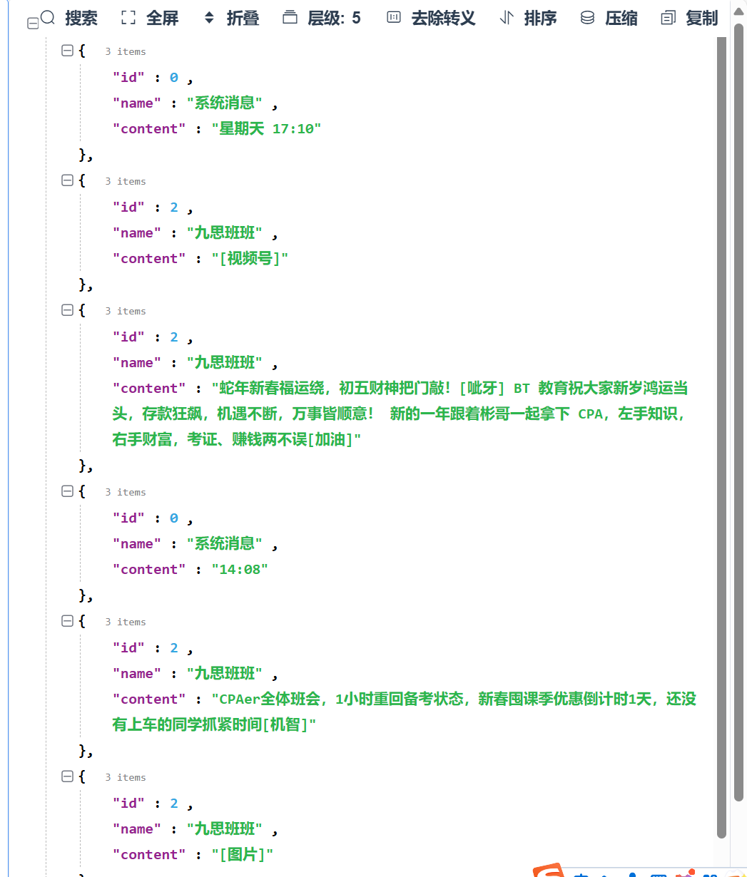 list_content=[{'id': 0, 'name': '系统消息', 'content': '星期天 17:10'}, {'id': 2, 'name': '九思班班', 'content': '[视频号]'}, {'id': 2, 'name': '九思班班', 'content': '蛇年新春福运绕,初五财神把门敲![呲牙]\n\nBT 教育祝大家新岁鸿运当头,存款狂飙,机遇不断,万事皆顺意!\n\n新的一年跟着彬哥一起拿下 CPA,左手知识,右手财富,考证、赚钱两不误[加油]'}, {'id': 0, 'name': '系统消息', 'content': '14:08'}, {'id': 2, 'name': '九思班班', 'content': 'CPAer全体班会,1小时重回备考状态,新春囤课季优惠倒计时1天,还没有上车的同学抓紧时间[机智]'}, {'id': 2, 'name': '九思班班', 'content': '[图片]'}]